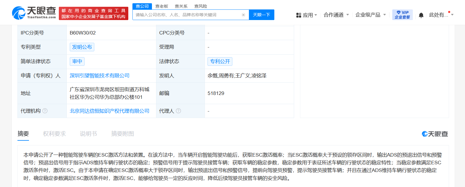 据天眼查信息显示,深圳引望智能技术有限公司在智能驾驶技术的研发上持续投入,已取得了多项重要专利。此次公布的ESC激活方法与装置专利,无疑将为智能驾驶车辆的安全性提供有力保障,推动智能驾驶技术的进一步发展。